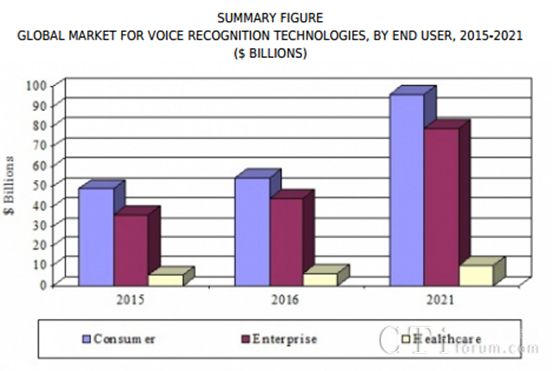 CTI論壇(ctiforum.com)4月19日消息(編譯/老秦):語音識別技術(shù)的全球市場價值2015年是903億美元,2016年是1044億美元,預(yù)計在2021年達到1849億美元,年復(fù)合增長率(CAGR)為12.1%,這是一份來自BCC Research的報告得出的數(shù)據(jù)。