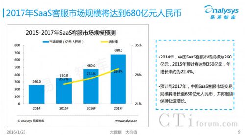 易觀智庫(kù)的一項(xiàng)研究稱,預(yù)計(jì)到2017年,中國(guó)SaaS客服市場(chǎng)交易規(guī)模將增長(zhǎng)至680億元人民幣,并將繼續(xù)保持快速增長(zhǎng)。