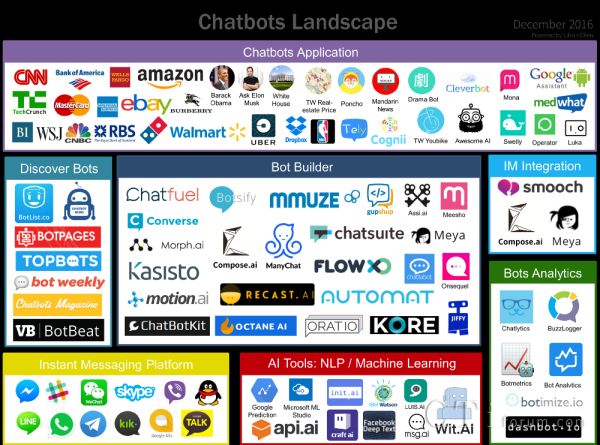 各大公司如CNN、BI、TechCrunch、CNBS等媒體,Uber、Dropbox、Burberry等品牌,電商平臺(tái)如eBay、Amazon、Walmart及銀行與信用卡公司如美國(guó)銀行、富國(guó)銀行、RBS、美國(guó)運(yùn)通、MasterCard等皆陸續(xù)推出自己的Chatbots。