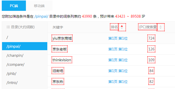 我們可以清晰的看到僅/pinpai/這個欄目頁,就創(chuàng)建了僅4萬條的關(guān)鍵詞排名,預(yù)估可以帶來4.3-8.9萬個IP。