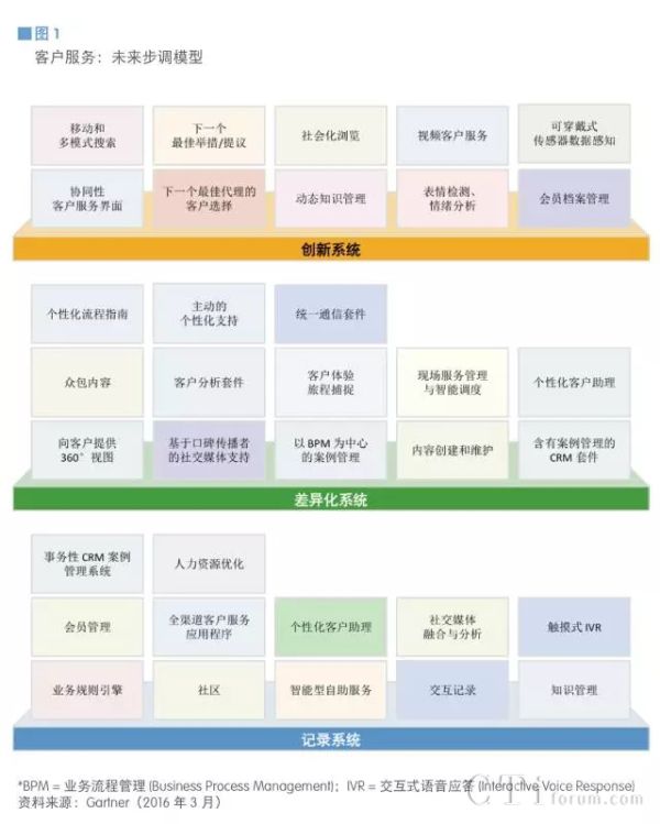 Gartner認為技術創(chuàng)新有時領先于客戶需求,有時滯后于客戶需求。在本報告中,我們采用步調(diào)分層這一方法從以下三個層次對現(xiàn)有和新興技術要求做了分析:記錄系統(tǒng)、創(chuàng)新系統(tǒng)、差異化系統(tǒng)。對于客戶服務,我們劃分了下列層次: