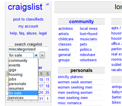 但該方案對那些目的性不強、領域知識又較遜色的用戶來說并不算適用,他們很可能會不確定一開始的時候選擇哪個類別。不恰當?shù)念悇e選擇會直接導致他們搜到毫不相干的內容,亦或者范圍被縮得太窄而出現(xiàn)零結果,從而降低了偶然發(fā)現(xiàn)有用信息的可能性(譯者注:無目的用戶往往會對這類“不經意”發(fā)現(xiàn)的信息有所行動)。Craigslist的網(wǎng)站上提供了一系列選擇,但如果你想要找的是一個焦點小組又應該選擇哪個類別呢?
