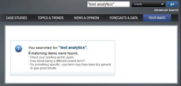 這個問題在當一個既有的范圍限制被默認應用于新的搜索請求時會變得更加復雜(譯者注:比如天貓進入某一店鋪后搜索框的“搜索本店”和“搜索全部”的差別,想象一下如果現(xiàn)在只有“搜索本店”會是個怎樣的體驗)。比如在WARC網(wǎng)站上的“文字分析”類別里搜索“圖表”會出現(xiàn)零結果,但同樣的請求在“所有類別”里是會返還結果的。在所有情況下,特別是當搜索的結果為零時,最好的方案就是采用全局搜索,并在結果中明確地顯示當前搜索的范圍是什么。