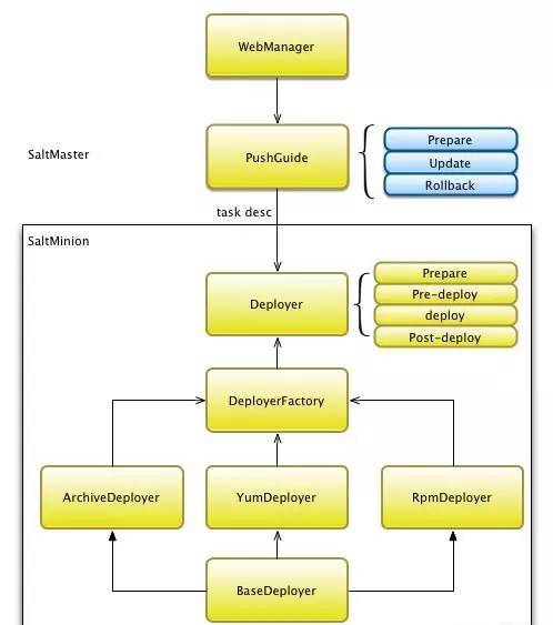 發(fā)布系統(tǒng)前端通過salt api與salt master進行通信, 發(fā)布任務描述信息到salt master。salt master通過salt命令調(diào)用我們自己開發(fā)的模塊來完成一次發(fā)布任務。