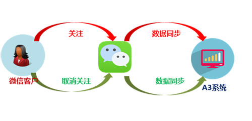 - 當(dāng)客戶關(guān)注企業(yè)微信公眾號后,可將微信客戶數(shù)據(jù)同步到A3系統(tǒng)中,并記錄新增粉絲數(shù)。