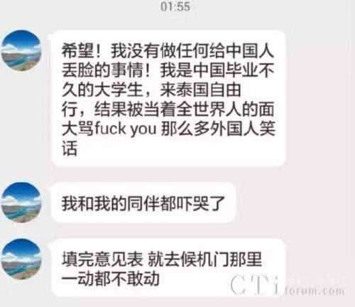 當事中國游客接受媒體采訪時講述了事情經(jīng)過:“2017年1月5日晚19時,我與同伴搭乘CZ8324航班由曼谷素萬那普國際機場飛回深圳,換了機票安檢完,進入海關護照查驗區(qū)域排隊,發(fā)現(xiàn)我們的離境卡被放入旅行箱托運了,于是我向站在旁邊的一位女性工作人員詢問哪里拿卡,我很謙虛有禮貌地詢問,對方并不理睬,我又問了一遍,她十分不耐煩,她不會說中文也不會說英文,用泰語和我對話,我怎么聽得懂?我比劃到最后她用力往我手上拍了一張離境卡,我用英文說我們兩個人,還需要一張,她問我是哪里人,我說中國人,她更加用力往我手上拍了一張卡,說了一句f**kyou。我蒙了轉(zhuǎn)身就走,她一直追著我罵。那么多排隊的人,哄堂大笑。笑我這個中國人嗎?!不!他們是在笑這位泰國最大機場的工作人員追著客戶罵!我必須要求道歉以及解決方法!”
