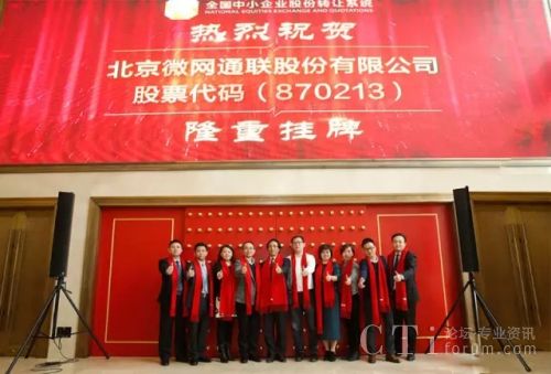 2017年1月6日上午,北京微網(wǎng)通聯(lián)股份有限公司(證券簡稱:微網(wǎng)通聯(lián),證券代碼:870213)在全國中小企業(yè)股份轉(zhuǎn)讓系統(tǒng)中心隆重舉行新三板掛牌敲鐘儀式。微網(wǎng)通聯(lián)CEO張福連攜公司董監(jiān)高,合作機構(gòu)代表等一行十人共同出席掛牌儀式,一同見證微網(wǎng)通聯(lián)這一重要時刻。