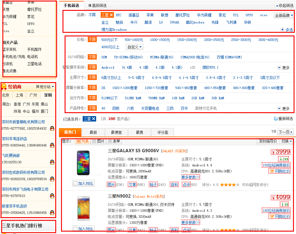 我們繼續(xù)搜索“三星手機”這個詞,進入太平洋網(wǎng)站,其網(wǎng)站標(biāo)題為:三星手機最新報價_最新三星手機【最新報價大全】。關(guān)鍵詞滿足報價需求。從太平洋的內(nèi)容我們會發(fā)現(xiàn),可以選擇三星手機價格、網(wǎng)絡(luò)、系統(tǒng)、尺寸、分辨率等。同時底部可以發(fā)現(xiàn)三星手機的型號參數(shù)、價格及圖片,可以說搜索“三星手機”下拉框的所有需求都被滿足。同時我們可以看到有其他產(chǎn)品的選擇、經(jīng)銷商的聯(lián)系方式、手機相關(guān)產(chǎn)品選擇、手機資訊、三星手機排行榜及對比的功能,這些并不屬于需求,但與關(guān)鍵詞“三星手機”有密切相關(guān),我們可以把他們列為“附加價值”,當(dāng)做一個關(guān)鍵詞的網(wǎng)站非常多的時候,競爭自然非常大,那么我們在滿足關(guān)鍵詞需求的時候,還需要增加附加價值的布局來提高網(wǎng)站的體驗問題。