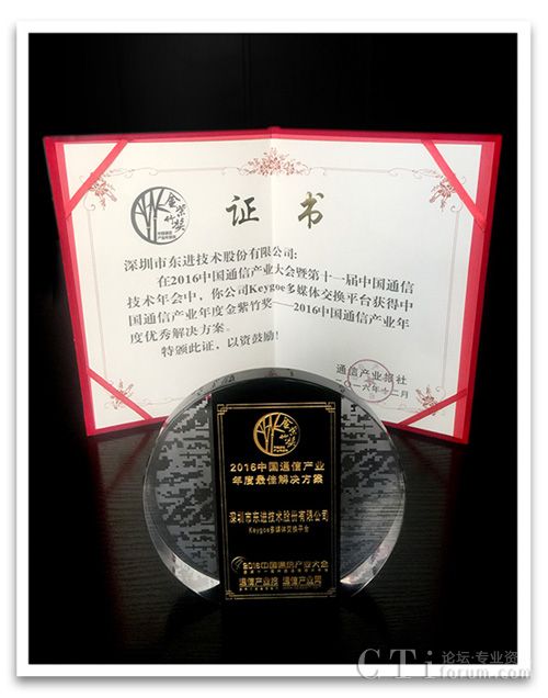 (圖:東進keygoe平臺獲獲2016中國通信產業(yè)年度最佳解決方案獎)