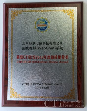 12月23日,容聯(lián)七陌云客服榮獲CTI論壇2016年度編輯推薦--“在線客服系統(tǒng)”獎(jiǎng)項(xiàng)。CTI論壇編輯推薦獎(jiǎng)是由中國(guó)領(lǐng)先的信息和通信技術(shù)行業(yè)網(wǎng)站CTI論壇舉辦的年度ICT領(lǐng)域技術(shù)評(píng)選活動(dòng),評(píng)選范圍涵蓋國(guó)內(nèi)主要ICT技術(shù)和產(chǎn)品應(yīng)用。