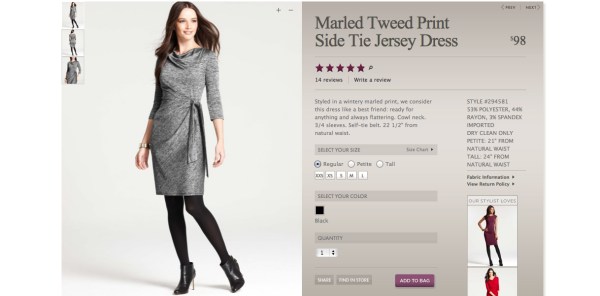 Ann Taylor gets it right將大部分的頁面空間貢獻(xiàn)給了高質(zhì)量產(chǎn)品圖片,同時提供大量額外的產(chǎn)品信息。你可以在這里找到非常多的產(chǎn)品細(xì)節(jié),比如不同尺寸裙子的長度,紡織品的質(zhì)地等等。但是這些信息并沒有喧賓奪主,頁面上更重要的信息,例如產(chǎn)品價格和用戶評分,依然占了大頭。