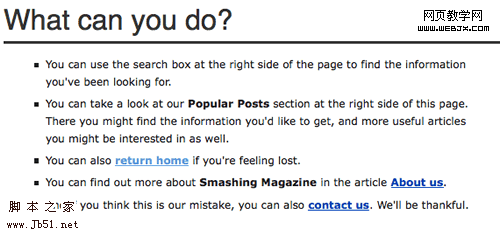 如果你不明確的告訴你的服務器如何處理404錯誤,它將默認提供一個單調而普通的錯誤頁面。比如在一個白色的頁面上顯示“沒找到 – 請求的URL不能被找到”云云。對用戶來說,這是毫無幫助的和相當痛苦的。一個404頁面應該開起來像個錯誤頁面,但是它也應該看起來仍然是你的網站。如果你在是用一個CMS,一般來說這已經為你處理好了。如果你使用一個靜態(tài)網站,你可以通過你的.htaccess(Apache服務器)文件指定一個404模板。