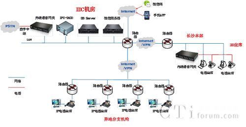 1) 鑒于陽光100分支機(jī)構(gòu)較多,將核心設(shè)備(外線接入語音網(wǎng)關(guān)、IPC-9100、業(yè)務(wù)服務(wù)器、微信服務(wù)器)托管至于三線IDC機(jī)房;通過VPN專線與長沙本部及各地分支機(jī)構(gòu)連接,長沙本部20坐席(采用網(wǎng)關(guān)+話務(wù)盒耳麥方式),各地分支項(xiàng)目約5-10坐席(采用IP話機(jī)方式);