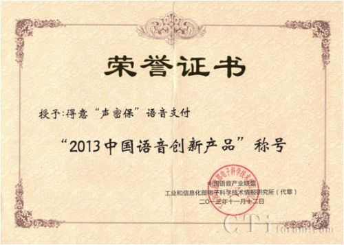 得意“聲密保”榮獲“2013中國(guó)語(yǔ)音創(chuàng)新產(chǎn)品”稱號(hào)