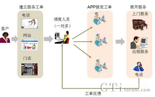 “服務e”高效的將企業(yè)的呼叫中心和二線人員的手機APP進行整合,實現了服務調度一體化。簡述“服務e”的工作流程:
