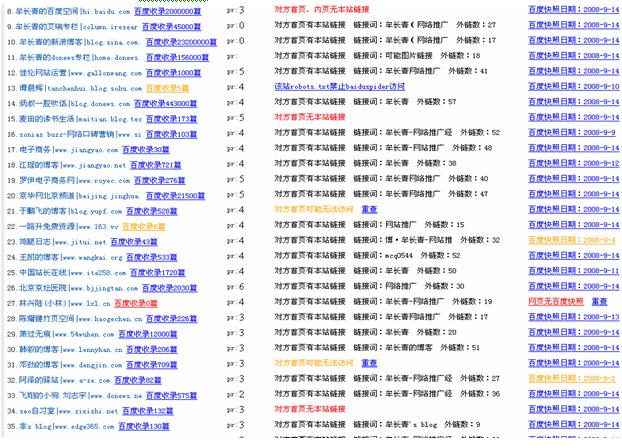 通過上圖可以看到,我鏈接的網(wǎng)站對方的百度收錄情況,對方的PR值情況,對方首頁內(nèi)頁是否掛了我的鏈接,掛的關(guān)鍵詞是什么,是在對方外鏈第幾的個位置,對方最近的百度快照日期又是多少,這些這些都是交換友情鏈接衡量SEO效果的標(biāo)準(zhǔn)。有了這個工具,交換再多友情鏈接都不怕沒時間檢查了。我現(xiàn)在就每周檢查一次,發(fā)現(xiàn)有提示沒有掛我的網(wǎng)站,就去實(shí)際檢查下,確認(rèn)對方去掉了,我這邊也就相應(yīng)的去掉。該網(wǎng)站地址: