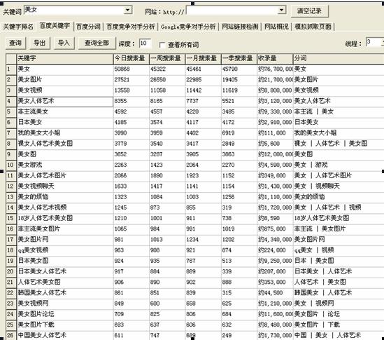 通過圖5大家可以看到,我通過這個工具輸入關(guān)鍵詞“美女”我就得到了和美女相關(guān)的一些熱門詞的百度指數(shù)情況。假設(shè)我要去做美女圖片站的SEO,就知道除了主關(guān)鍵詞“美女”還有哪些詞有比較大的搜索量,值得我去做SEO。