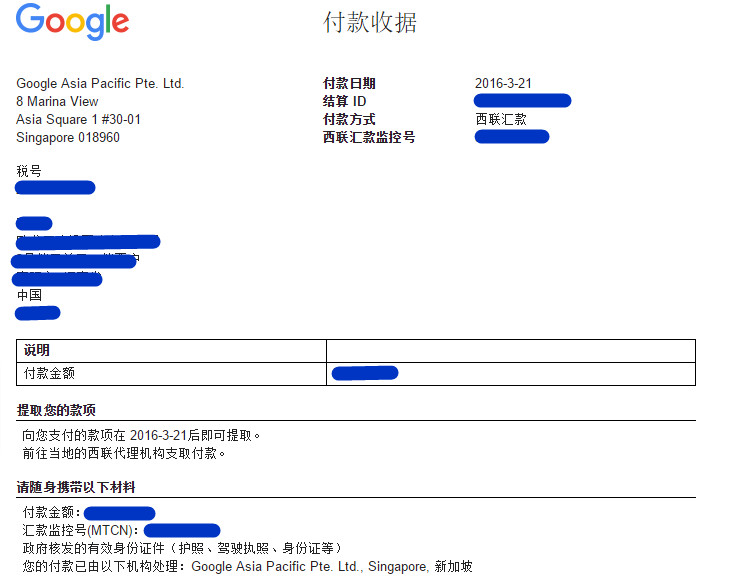 這個谷歌的付款收據(jù)其實只需要記住金額、匯款監(jiān)控號、匯款機(jī)構(gòu)所在國家就可以使用網(wǎng)上收匯了