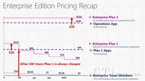 Business Edition SKU每個(gè)用戶每月的費(fèi)用是50美元,F(xiàn)inancials應(yīng)用程序單獨(dú)的費(fèi)用為每個(gè)用戶每個(gè)月40美元。Enterprise Plan 1每個(gè)用戶每個(gè)月的費(fèi)用是115美元,而Plan 2每個(gè)用戶每個(gè)月的費(fèi)用是210美元。這些計(jì)劃中單個(gè)的應(yīng)用程序的價(jià)格都是95美元。所有這些價(jià)格都和九月份泄露出來的定價(jià)一致。