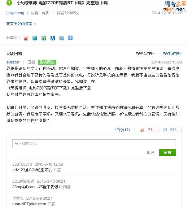 第三個是百度知道,又是一個引流神器,在這里特別是用在電影資源的下載上面。點擊這個知道進去一看,瀏覽量超過60000次,不過看內(nèi)容就知道是純通過SEO手法做的營銷貼,內(nèi)容八桿子打不到,只不過其中加入了關(guān)鍵詞。這種手法可能很多人不知道目的何在,不過只要你點擊評論就知道了,它的推廣信息藏在評論里面了。
