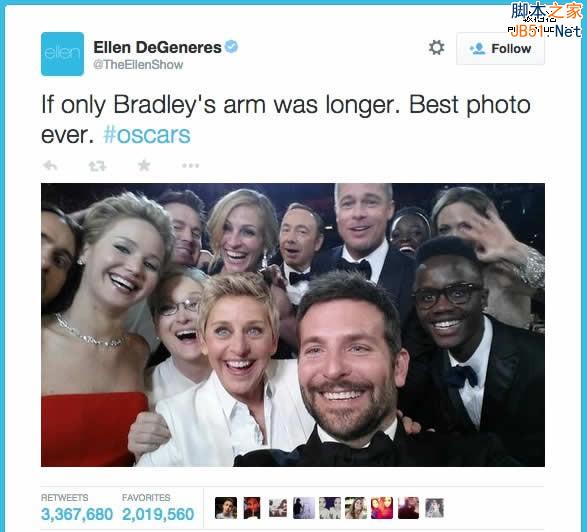 這或許是社交網絡上傳播最廣,關注度最高的一張自拍照。在本屆奧斯卡獎頒獎典禮上,主持人艾倫-德詹尼絲(Ellen DeGeneres)與詹妮弗-勞倫斯(Jennifer Lawrence)、布萊德利-庫珀(Bradley Cooper)等大牌影星完成了這張史無前例的自拍照。這張自拍照上傳到Twitter之后轉發(fā)量立馬超過了百萬次,之后《華爾街日報》確認這是一次事先策劃好的營銷活動。三星與奧斯卡組委會達成了植入廣告協(xié)議,盡管這張自拍照沒有提到三星這個品牌,但卻起到了無與倫比的廣告效應。