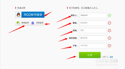 3、按步驟準(zhǔn)確填寫推薦人,2996295、,昵稱、密碼、手機(jī)號(hào)、最后點(diǎn)擊注冊 ;
