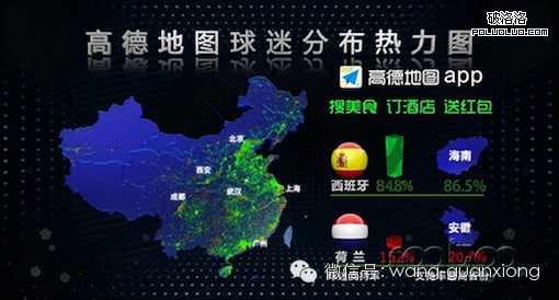 世界杯期間,高德地圖與央視5套“豪門盛宴”戰(zhàn)略合作,在每期節(jié)目中高德地圖利用LBS大數(shù)據(jù)做成“球迷熱力分布圖”向觀眾展示各省份對(duì)比賽兩隊(duì)支持率情況。支持率不代表比賽結(jié)果,雖然不能作為彩票下注,但高德地圖的熱力分布圖讓觀眾有一種強(qiáng)烈的自主參與感。