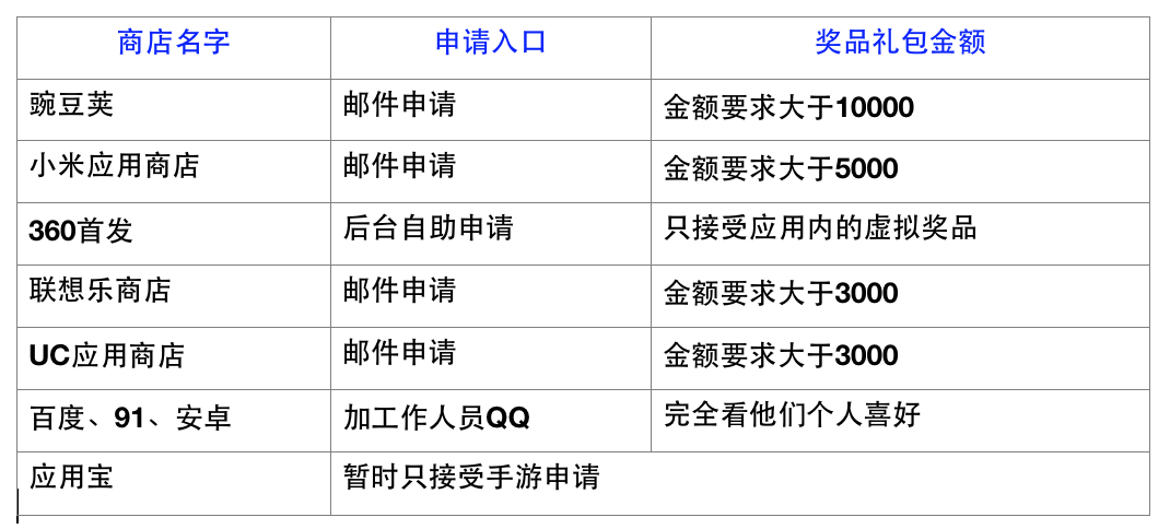 禮包抽獎(jiǎng)活動(dòng)——這個(gè)是要花錢買獎(jiǎng)品的,我好不容易說(shuō)服公司拿了 1.5 萬(wàn)出來(lái)賣獎(jiǎng)品,和 3 個(gè)應(yīng)用商店做了抽獎(jiǎng)活動(dòng),但是結(jié)果和不花錢的首發(fā)效果差不多,我估計(jì)公司以后再也不給我錢做推廣了。也做了一個(gè)應(yīng)用商店禮包抽獎(jiǎng)名單,供大家參考。