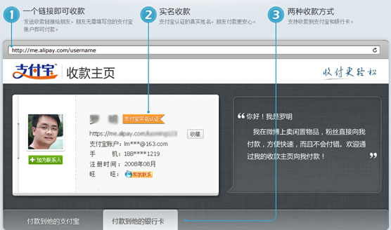 話說還有很多人不知道這個收款主頁,當(dāng)然平時用不到的人不知道很正常,順便普及下,不然這個頁面也死得很冤。簡單的說,這個收款主頁就是有你的賬號信息的提供給別人的付款頁面(如圖),把鏈接發(fā)給付款人,然后付款人直接在這頁面打錢就是了。話說小馬哥為什么會突然斬殺這個收款頁面呢,八成跟移動支付有關(guān)。