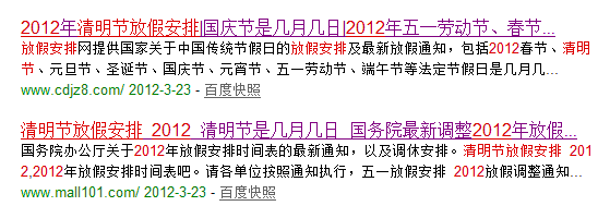 第四和第五是兩個獨立網站,所以出于筆者的愛好,點進去看了下(因為清明節(jié)這種放假安排,一般都是大門戶內頁或者政府網站公告占據前排,獨立網站排名這么好,肯定是有SEO操作的。)