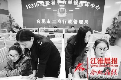走進這個幾十平米的大廳,背景墻上寫著大大的“12315消費者申訴舉報指揮中心”,這里就是合肥市工商局12315維權(quán)熱線的中樞,全市的消費者撥打12315呼叫中心的電話都會匯集到這里。