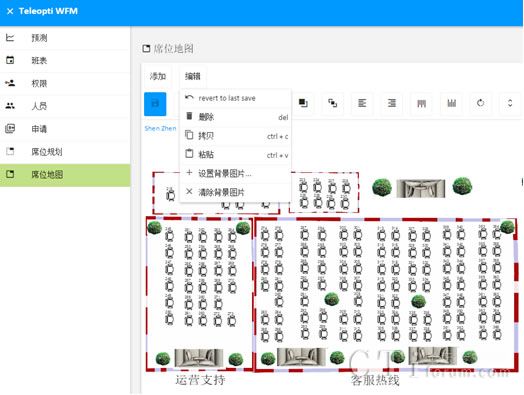 Teleopti推出的座位管理模塊包括兩個(gè)部分,座位規(guī)劃器(seat planner)和座位圖(seat map)。在座位圖中(見(jiàn)下圖1),用戶可以按照現(xiàn)場(chǎng)的座位排布需求,利用Teleopti座位圖功能輕松快捷的繪制出和現(xiàn)場(chǎng)坐席位置相同的座位排布,甚至可以美化座位圖添加附屬附件,包括現(xiàn)場(chǎng)擺設(shè),緊急出口等等,最大程度的還原現(xiàn)場(chǎng)原貌,從而提供給查看座位圖的對(duì)象極佳的用戶體驗(yàn)。在座位規(guī)劃器中(見(jiàn)下圖2),用戶可以選定排座對(duì)象,排座周期進(jìn)行排座,甚至可以進(jìn)行單天排坐等等靈活的選擇方案。排座的算法新穎而智能,不同條件的規(guī)則按照其優(yōu)先級(jí)可以進(jìn)行結(jié)果優(yōu)化。由系統(tǒng)輸出最具優(yōu)化的排座結(jié)果。這種配置靈活,性能優(yōu)良的排座模塊可以適用于各種大中小型的客戶服務(wù)中心座位排布。對(duì)于現(xiàn)場(chǎng)有充足座位的用戶,可以高效智能的安排出每一個(gè)座位每一天可以被排布的具體對(duì)象;對(duì)于現(xiàn)場(chǎng)座位不充足的用戶,也可以通過(guò)模塊的座位復(fù)用功能最大限度的在一天里復(fù)用每一個(gè)有限的座位。