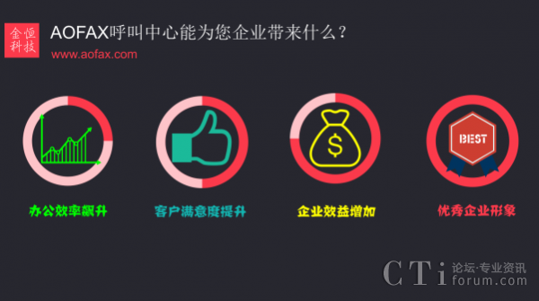 此外,AOFAX呼叫中心還內(nèi)嵌了企業(yè)聊天、在線客服、語(yǔ)音自動(dòng)導(dǎo)航IVR、智能ACD路由功能、來(lái)去電彈屏、無(wú)紙傳真、知識(shí)庫(kù)和電話錄音等功能,為企業(yè)搭建一個(gè)一體化的呼叫中心系統(tǒng)。更多語(yǔ)音外呼系統(tǒng)和呼叫中心可以咨詢中國(guó)傲發(fā)網(wǎng)(www.aofax.com)