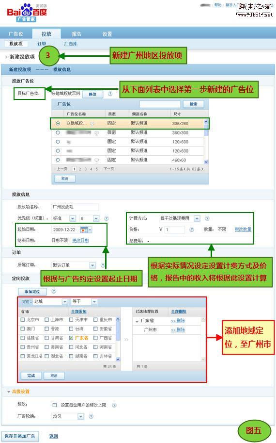 3) 通過導航“投放”→“投放項”→“新建投放項”,進入圖五所示頁面,填寫廣州投放項相關(guān)信息。