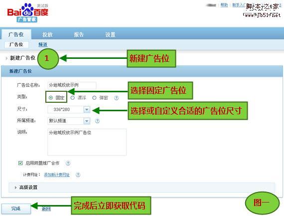 1) 通過導航“廣告位”→“廣告位”→“新建廣告位”進入圖一所示頁面,填寫相關(guān)信息。