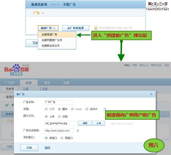 4) 保存投放項后,進入圖六所示頁面,點擊“新建廣告”-》“創(chuàng)建普通廣告”,創(chuàng)建面向廣州用戶的廣告。至此所有操作已完成,您可以到網(wǎng)站查看實際投放效果。
