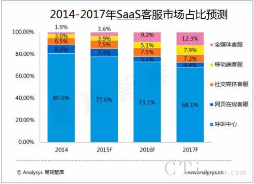 根據(jù)易觀報(bào)告顯示,中國(guó)SaaS客服中傳統(tǒng)客服渠道仍舊占有較大份額,如呼叫中心仍受33.0%的消費(fèi)者偏好,2014年語(yǔ)音呼叫中心占據(jù)整體SaaS客服市場(chǎng)80.4%的市場(chǎng)份額。但調(diào)研數(shù)據(jù)顯示,三分之二客戶偏好來(lái)自網(wǎng)頁(yè)端、移動(dòng)端、微信公眾號(hào)、微博等互聯(lián)網(wǎng)渠道客服類型。隨著移動(dòng)互聯(lián)網(wǎng)井噴,消費(fèi)者全面轉(zhuǎn)向移動(dòng)設(shè)備進(jìn)行消費(fèi)和交易,尤其是移動(dòng)端客服,將逐漸成為SaaS客服的主流。易觀智庫(kù)預(yù)計(jì)2017年移動(dòng)端客服將占整體SaaS客服市場(chǎng)7.9%的市場(chǎng)份額,全媒體客服將占據(jù)市場(chǎng)12.3%的市場(chǎng)份額。這說(shuō)明移動(dòng)端和全媒體客服形式具有強(qiáng)勁市場(chǎng)潛力。
