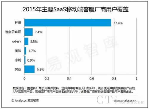 根據(jù)易觀報(bào)告,SaaS客服市場(chǎng)廠商占有率出現(xiàn)比較明顯的集中趨勢(shì)。其中,環(huán)信移動(dòng)客服用戶覆蓋占比為77.4%,穩(wěn)坐市場(chǎng)第一寶座,遙遙領(lǐng)先競(jìng)品廠商,為“互聯(lián)網(wǎng)+”時(shí)代的客戶服務(wù)產(chǎn)品樹(shù)立了一個(gè)新的標(biāo)桿。