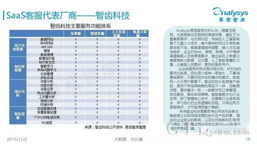 11月3日,易觀國際重磅推出《2015中國企業(yè)級(jí)SaaS市場年度綜合報(bào)告》,報(bào)告從市場行業(yè)整體、市場潛力、市場用戶及廠商運(yùn)營等維度深入分析當(dāng)前國內(nèi)企業(yè)級(jí)SaaS服務(wù)發(fā)展現(xiàn)狀,并對(duì)未來的企業(yè)級(jí)SaaS市場風(fēng)向做出預(yù)判--2016年,企業(yè)服務(wù)SaaS規(guī)模將超300億。以人工智能為核心,致力于以技術(shù)驅(qū)動(dòng)客服行業(yè)變革的智齒客服,作為唯一一家在線客服領(lǐng)域企業(yè)上榜,與銷售管理領(lǐng)域代表銷售易、協(xié)同領(lǐng)域今目標(biāo)、人力資源管理領(lǐng)域北森等廠商一道,成為當(dāng)前國內(nèi)SaaS發(fā)展的樣本。