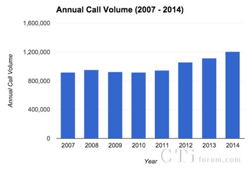 從2007年開始,呼叫中心每年接到的報警電話在90萬次左右,有些年份還有降低,但是從2011年開始,報警電話的數(shù)量開始持續(xù)增長。2014年,呼叫中心接到了120萬次報警電話,比2011年增長了28%。與此同時,呼叫中心的警員數(shù)量并沒有這么大幅度的增長,大家疲于奔命也就很好理解了。