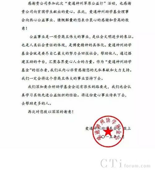愛通神州助學(xué)基金向信普飛科發(fā)送感謝信