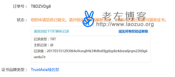 這里有三種類型,我們是需要用免費(fèi)的,所以選擇TrustAsia,域名型DV是免費(fèi)的。直接提交訂單就可以。