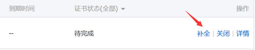 在阿里云后臺(tái)找到證書(shū)列表,然后看到我們當(dāng)前申請(qǐng)的證書(shū)還沒(méi)有補(bǔ)全資料。
