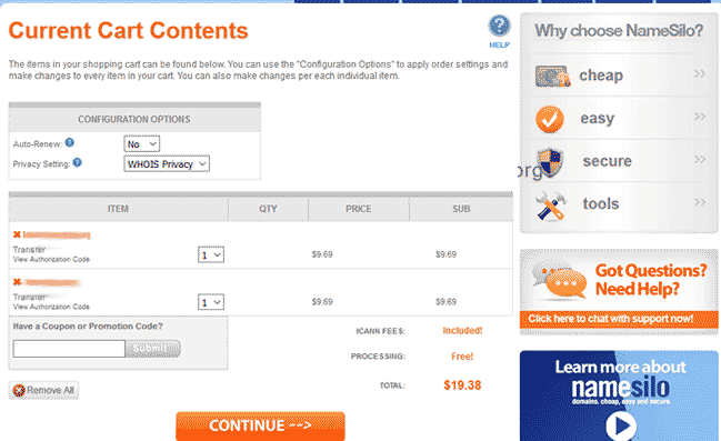 手上有2個域名原來在Namecheap注冊商的,還有幾天到期一看續(xù)費大約需要10美元左右且續(xù)費不贈送隱私保護,于是就折騰一番還可以節(jié)省個燒餅錢,準備將域名轉(zhuǎn)入到NameSilo注冊商,因為其商家轉(zhuǎn)入還是便宜的且還贈送隱私保護,如果以后用的不好來年續(xù)費之前繼續(xù)轉(zhuǎn)走。