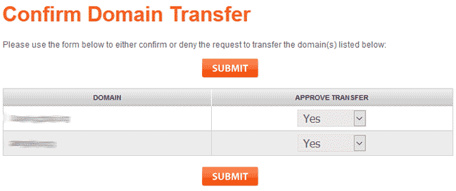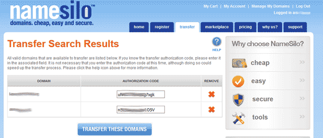 這里我們需要核對當前域名的轉(zhuǎn)移碼信息,然后點擊Transfer these domains按鈕繼續(xù)。