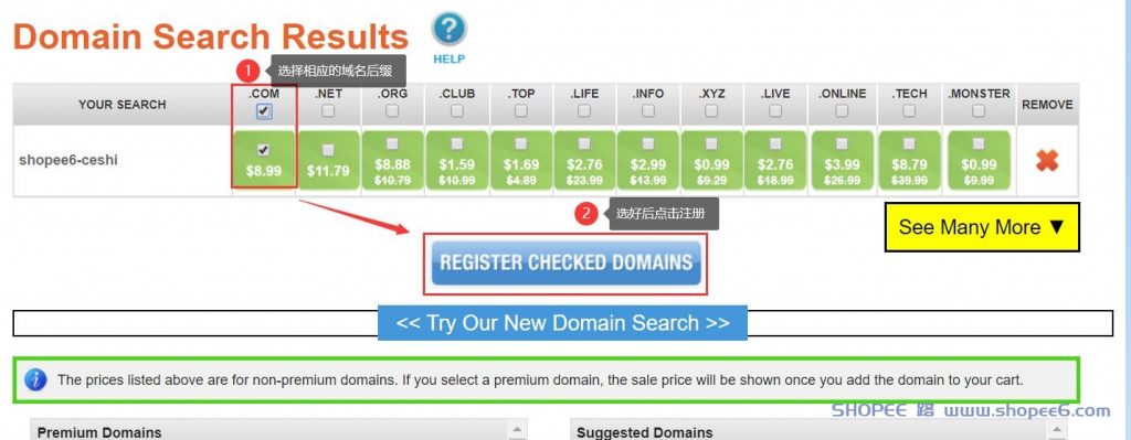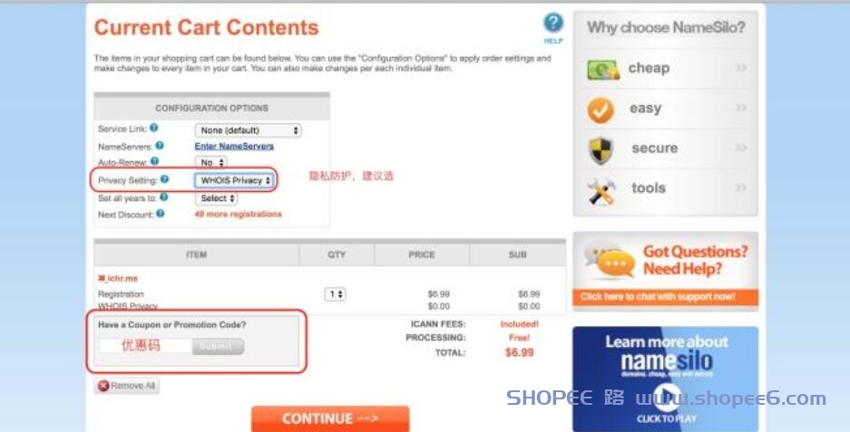 4、進(jìn)入購(gòu)物車了,如下圖,選擇域名保護(hù),同時(shí)輸入優(yōu)惠碼:Shopee6 ,然后就獲得了優(yōu)惠了。