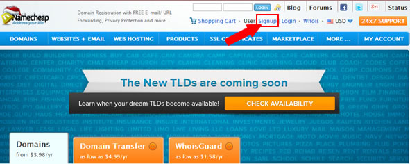 登陸Namecheap官網(wǎng)首頁之后看到頂部的”SIGN UP”文字鏈接即為注冊(cè)賬戶入口;