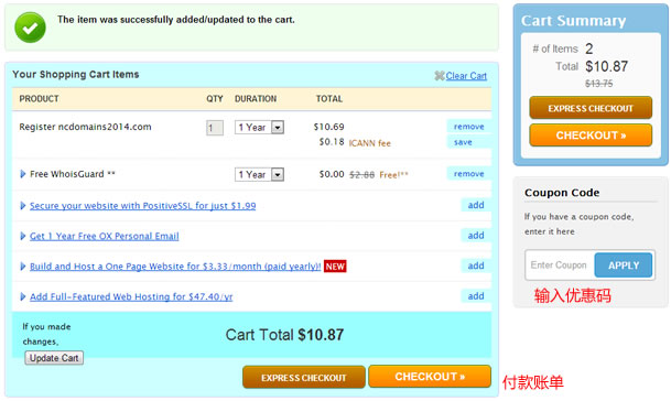 在賬單列表中我們看到域名原價(jià),可以在Coupon Code文本中輸入最新的Namecheap優(yōu)惠碼,點(diǎn)擊APPLY按鈕激活之后價(jià)格會(huì)降低,.COM域名優(yōu)惠之后是9.61美元,送一年隱私保護(hù)。