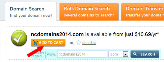 看到首頁的上圖,輸入自己需要注冊(cè)的域名以及后綴,點(diǎn)擊SEARCH按鈕檢測(cè)是否被注冊(cè);順便說一下,如果需要轉(zhuǎn)入,看到上圖的DOMAIN TRANSFER按鈕之后就是轉(zhuǎn)入域名步驟;