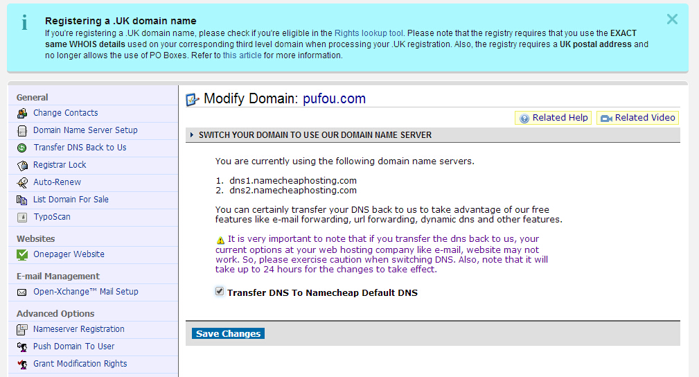 2.點(diǎn)擊“Transfer the DNS back to us”,頁面刷新后,選中“Transfer DNS to Namecheap Default DNS”復(fù)選框,點(diǎn)擊保存按鈕。
